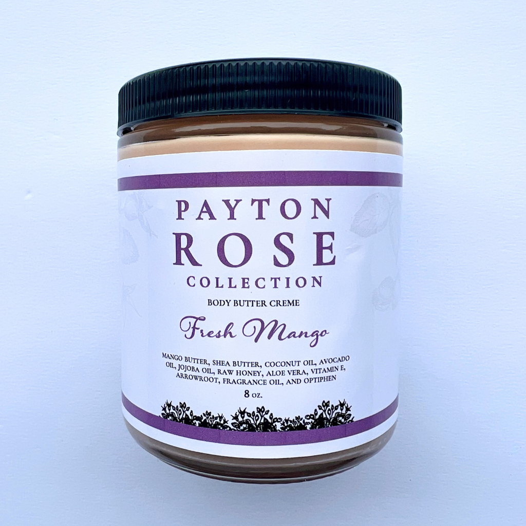 Ingredients: Mango butter, Shea butter, Coconut oil, Avocado oil, Jojoba oil, raw honey, aloe vera, arrowroot, fragrance oil, and optiphen plus.
